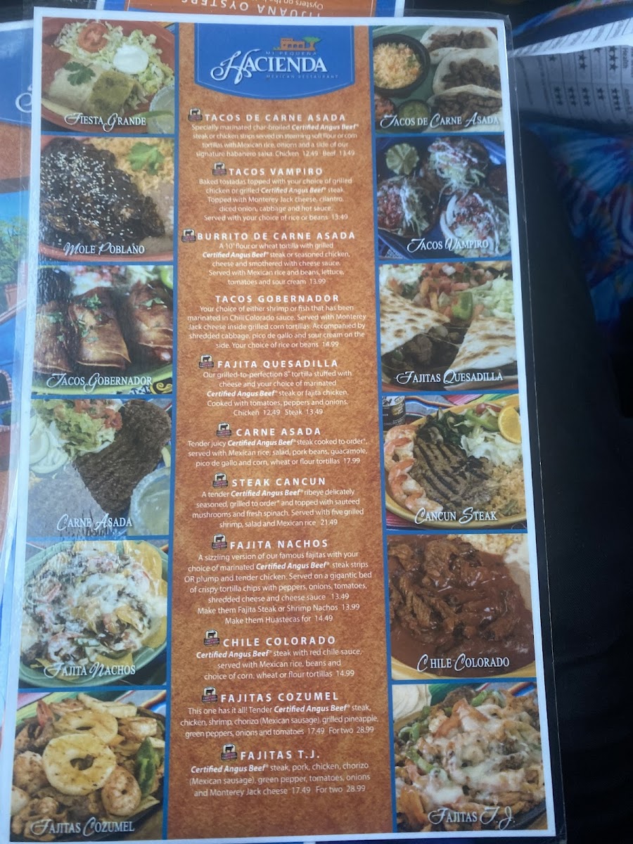 Appetizers like the La Hacienda Dip and Guacamole Dip beautifully balance fresh flavors with a hint of spice, setting the stage for a memorable meal. Dive into hearty entrées such as Carne Asada and Steak Mexicano, featuring succulent Certified Angus Beef, perfectly grilled to your liking, and served with classic sides that elevate each dish.